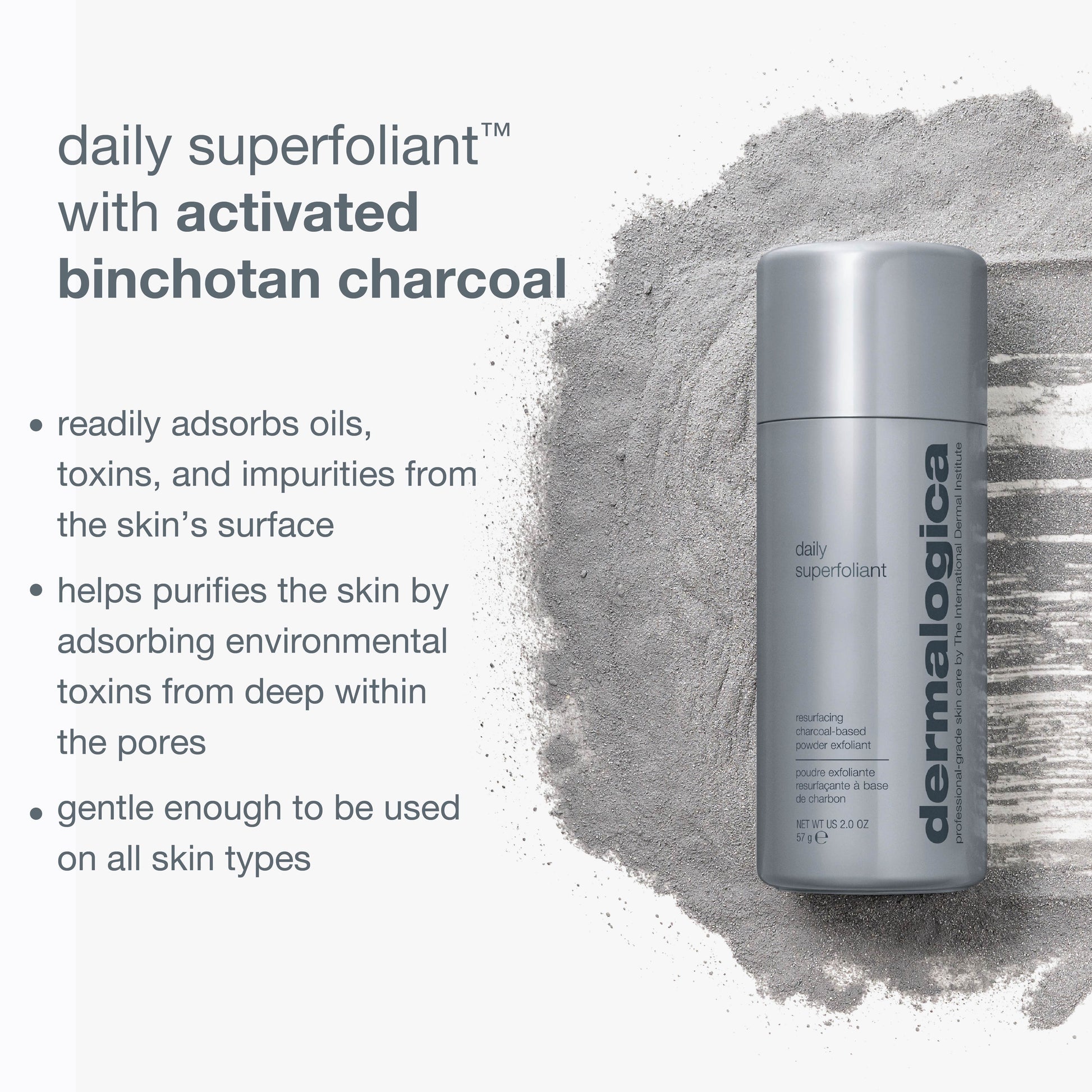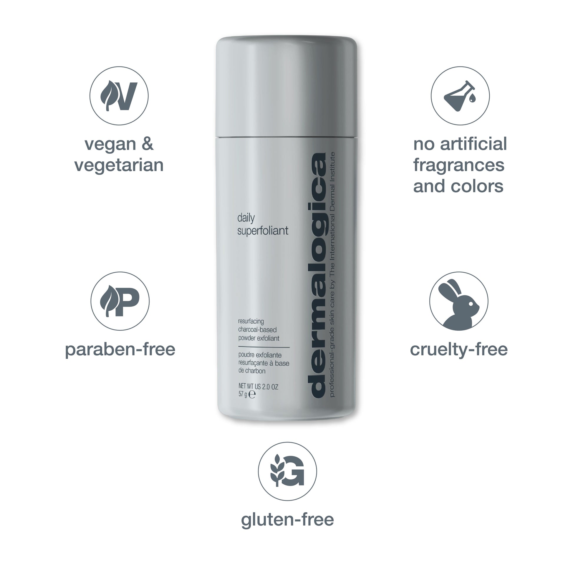 Microcrystalline Cellulose, Sodium Bicarbonate, Sodium Cocoyl Glutamate, Sodium Myristoyl Glutamate, Malic Acid, Sodium Methyl Cocoyl Taurate, Charcoal Powder, Vinyl Dimethicone/Methicone Silsesquioxane Crosspolymer, Maltodextrin, Silica, Magnesium Oxide, Oryza Sativa (Rice) Bran Extract, Polymethylsilsesquioxane, Sapindus Trifoliatus Fruit Extract, Niacinamide, Citrus Aurantium Amara (Bitter Orange) Peel Oil, Zingiber Of cinale (Ginger) Root Extract, Lavandula Angustifolia (Lavender) Oil, Lavandula Hybrida Oil, Camellia Sinensis Leaf, Kappaphycus Alvarezii Extract, Caesalpinia Spinosa Fruit Pod Extract, Citrus Limon (Lemon) Peel Oil, Rosmarinus Of cinalis (Rosemary) Leaf Oil, Salvia Of cinalis (Sage) Oil, Subtilisin, Lipase, Papain, Lactic Acid, Oryza Sativa (Rice) Starch, Sodium Chloride, Sodium Dehydroacetate, Xanthan Gum, Water/Aqua/Eau, Coconut Acid, Calcium Lactate, Capryloyl Glycine, Undecylenoyl Glycine, Cetrimonium Chloride, Limonene, Linalool. Dermalogica is dedicated to maintaining the accuracy of the ingredient lists on this website. However, because ingredients are subject to change, we cannot guarantee that these lists are complete, up-to-date and/or error-free. For an accurate listing of ingredients in each product, please refer to your product packaging.